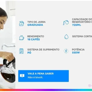 Aproveite café fresco e delicioso todos os dias com a Cafeteira Elétrica Britânia BCF19, perfeita para quem não abre mão de praticidade e sabor. Com potência de 550W, ela prepara até 18 cafezinhos de forma rápida, mantendo o aroma e a temperatura ideais. Seu acabamento em inox traz sofisticação e resistência, enquanto a jarra de…