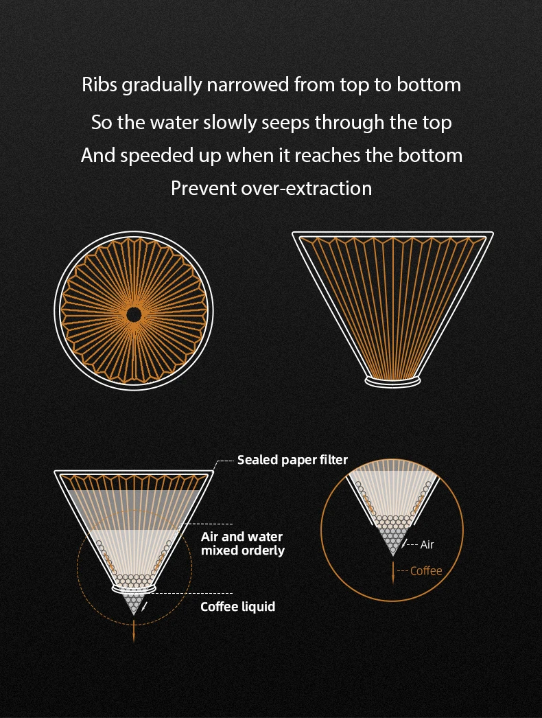 O diferencial está na engenharia do design: 33 prismas conectados formam ranhuras de desvio triangulares que conduzem a água uniformemente, promovendo uma extração completa e rica em sabor. O resultado é um café mais encorpado, equilibrado e com notas evidenciadas.