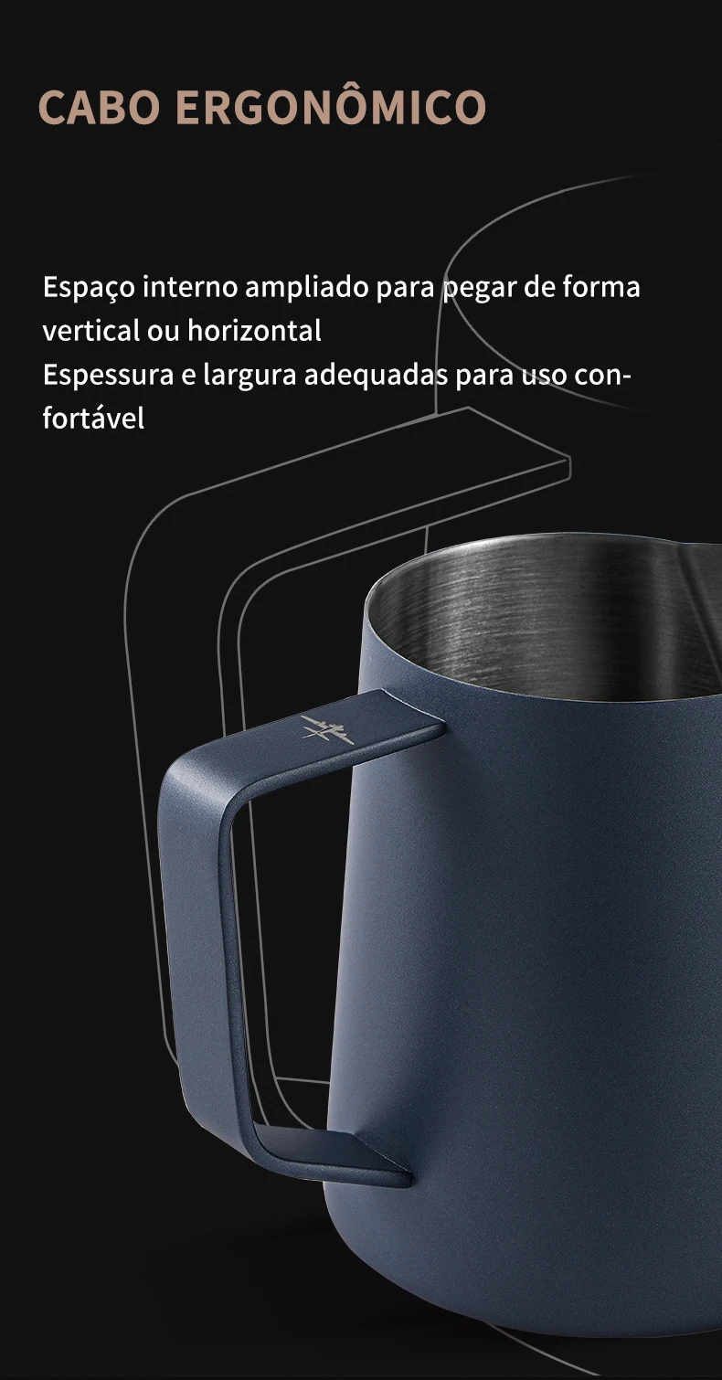 A alça ergonômica, bem calibrada em espessura e largura, adapta-se a diversas pegadas: tipo caneta, horizontal ou tradicional. Isso reduz o esforço e aumenta o conforto durante o uso, especialmente em ambientes de alta demanda como cafeterias.
