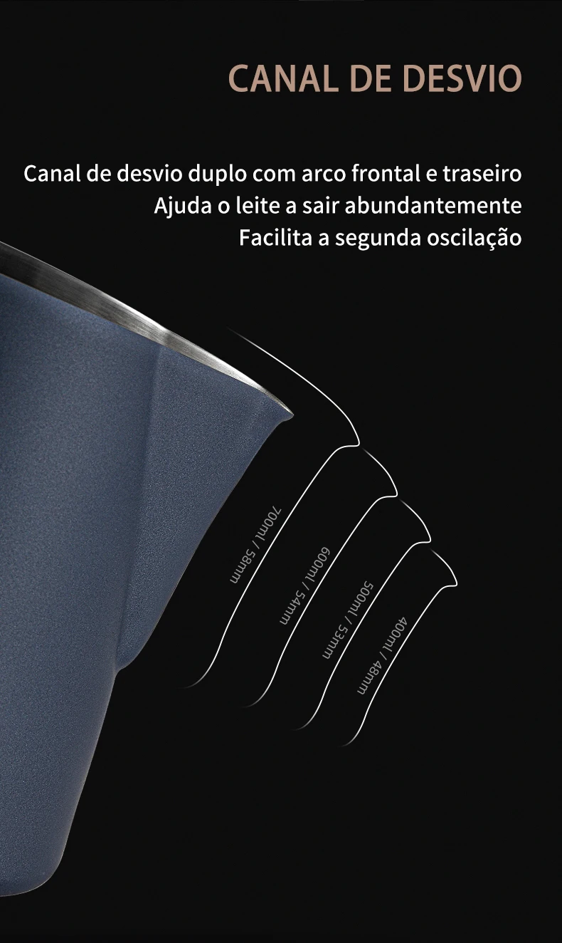 Seu bico de precisão em formato de crocodilo permite maior controle do fluxo de leite, tornando mais fácil desenhar linhas finas e padrões detalhados. O diferencial está nos sulcos internos e na trincheira de desvio frontal e traseira, que facilitam a liberação uniforme e fluida do leite vaporizado — principalmente na segunda fase da oscilação, onde a estabilidade e a direção do fluxo são essenciais para criar arte sobre o café.