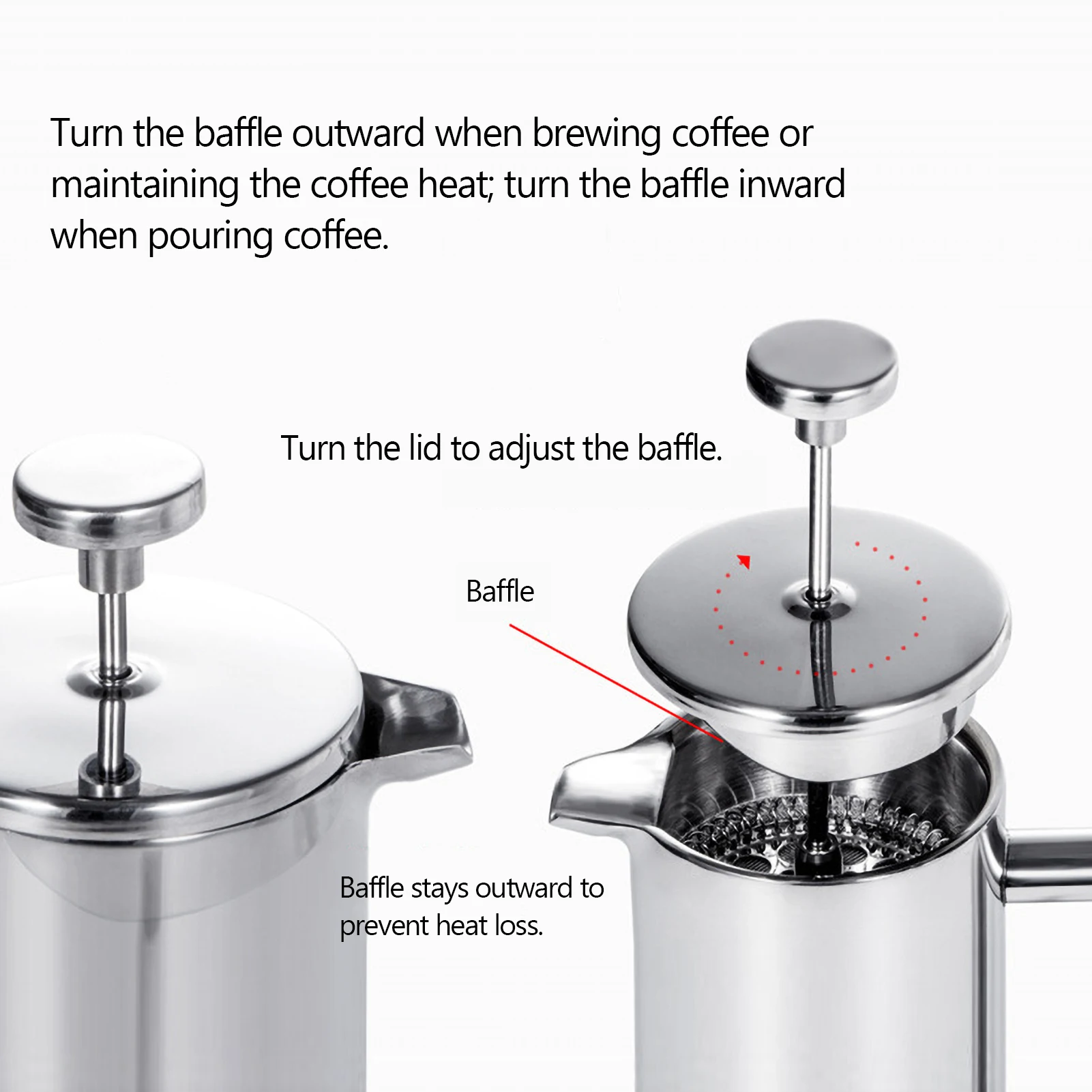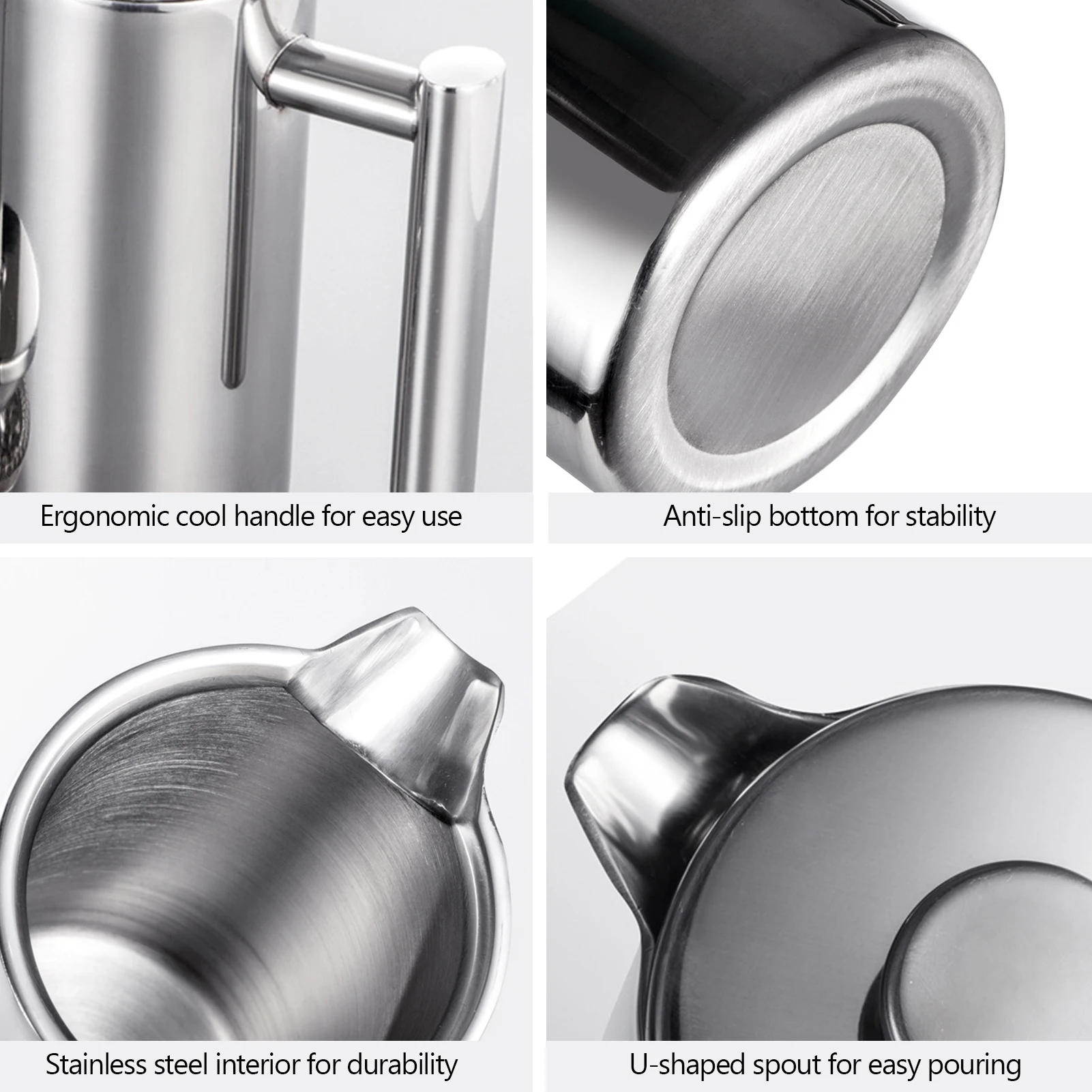 Esta cafeteira francesa de aço inoxidável é construída com construção de parede dupla para manter o calor do café e o filtro de malha fina para fazer café delicioso. Com alça ergonômica e bico em forma de U, esta cafeteira é fácil de usar, ótima escolha para casa e escritório.