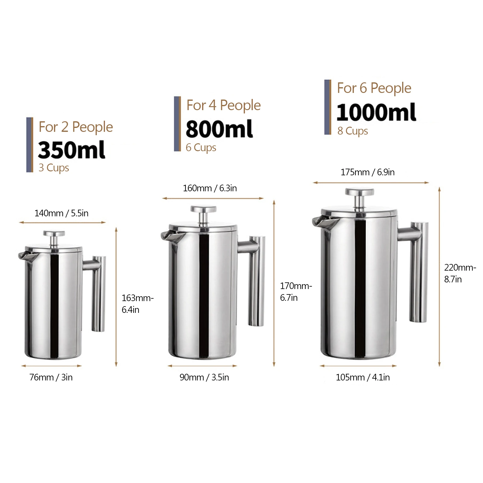 800ml: 90*170mm / 3.5 * 6.7in (D * H); peso: aprox. 620g/1,4lb