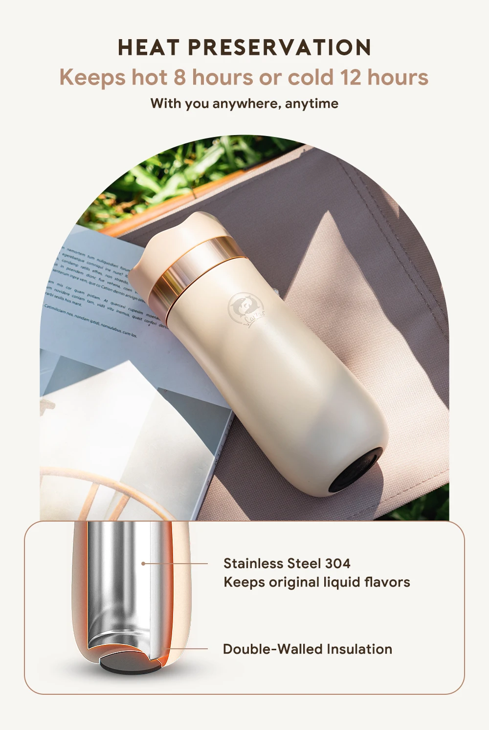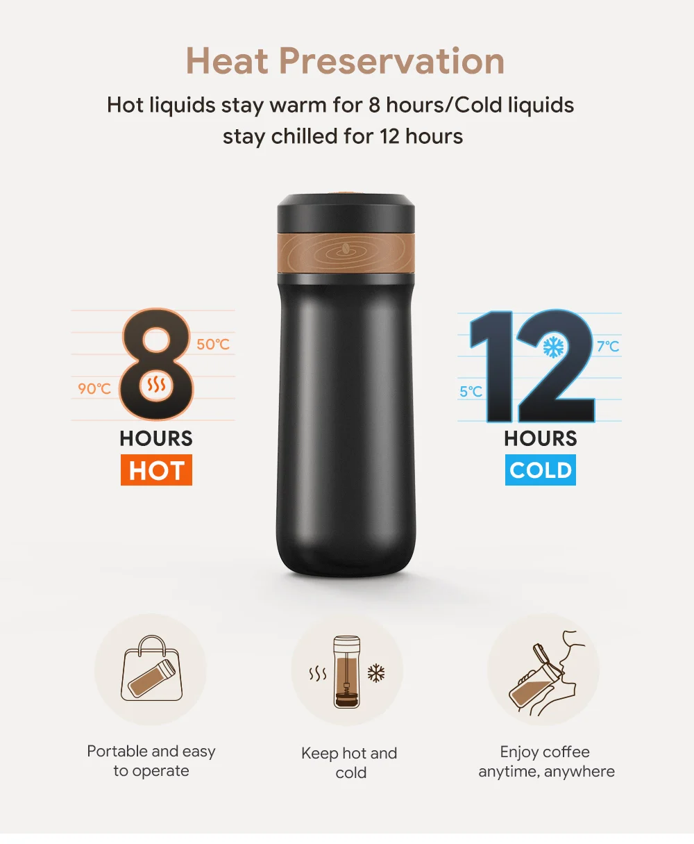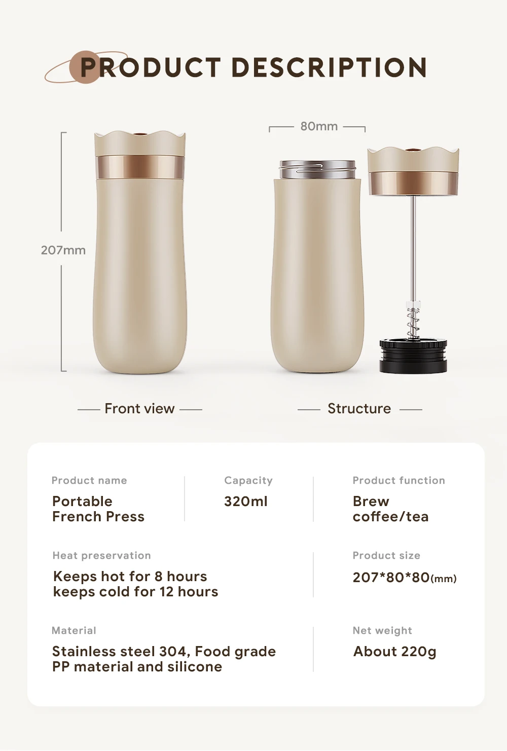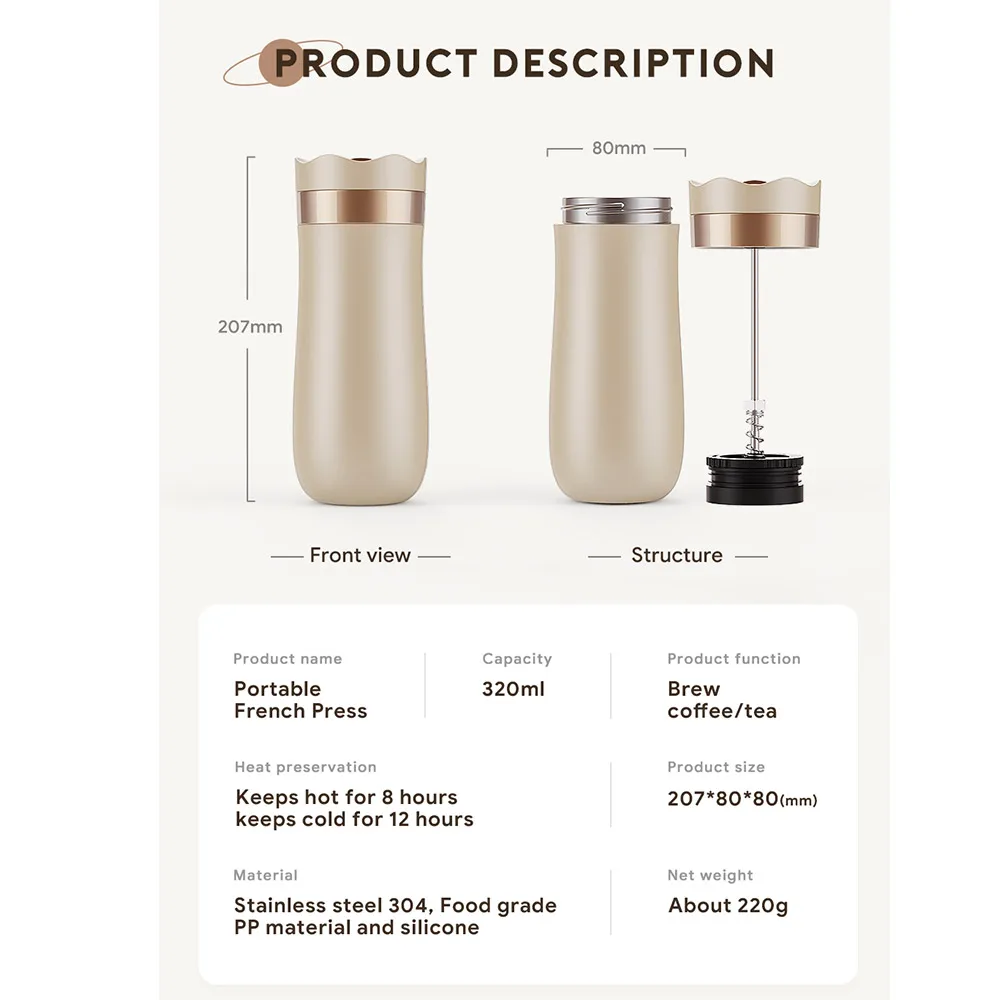 A prensa francesa portátil de 320ml da i Cafilas é a solução ideal para quem deseja preparar café fresco e encorpado em qualquer lugar — seja em viagens, no trabalho, no carro ou ao ar livre. Com design inteligente, estrutura compacta e materiais de alta qualidade, ela combina a praticidade de uma garrafa térmica com a eficiência do método de prensa francesa.