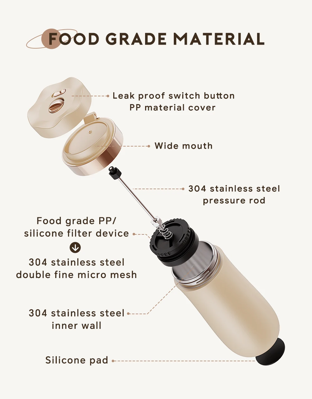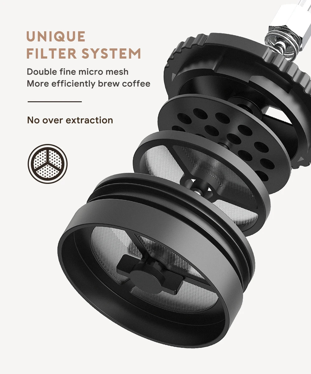 A tecnologia de separação de borra (slag-water separation) oferece uma extração limpa e sem resíduos, melhorando a experiência do usuário. O filtro embutido é eficiente e fácil de limpar, tornando o processo simples e rápido. Basta adicionar o pó de café, água quente, aguardar a infusão e pressionar o êmbolo integrado — o café estará pronto para beber diretamente na garrafa.